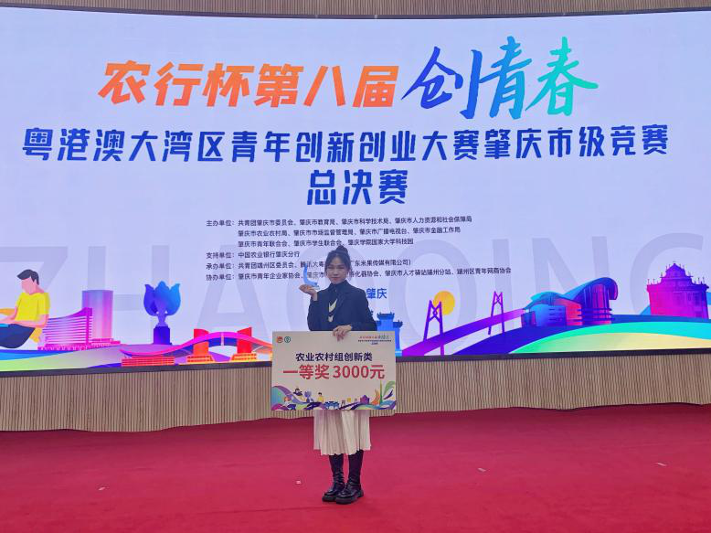 为了更好的提升创新创业能力,她也参加了第八届“创青春”粤港澳大湾区青年创新创业大赛肇庆市级竞赛决赛。经过激烈的角逐,最终获得农业农村组一等奖。