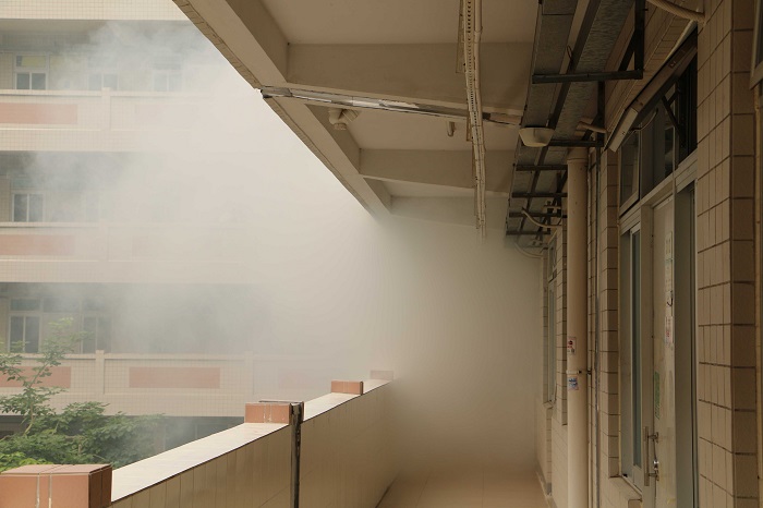 消防演练共分为12个宿舍区域,同时进行。以各幢学生宿舍303房为模拟起火点,各层宿舍学生依照疏散安排快速有序离开现场。只见“砰”一声响起,烟雾弹放出,急促的警报声随即响起,现场浓烟弥漫,不断外散。不少同学使用湿毛巾或者衣袖捂住口鼻,弯腰跑出宿舍,冲下楼梯,按规定路线疏散到安全地带。“同学们行动都很迅速,我反应过来后,便拿起湿毛巾跟着人群往外跑。”来自博学书院的麦同学说道。