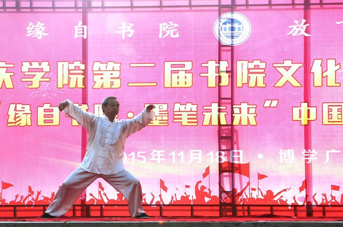 文化节上,四大书院院长为大家送上精彩表演。博学书院院长李炳全一身白衣,伴随着音乐开始太极表演。只见他双手运力打拳、收回、再单脚跳起、落地,刚健有力的动作赢得观众阵阵掌声,最终以吸气、双手平收的轻松姿态结束演出。在书院特色节目汇演上,传统武术中的跆拳道表演掀起活动高潮。多名学子叠罗汉,最高层的女生手持木板,一名男生快步向前跑几步,弹跳向上,有力地将木板踢下,引得底下观众拍手叫好。