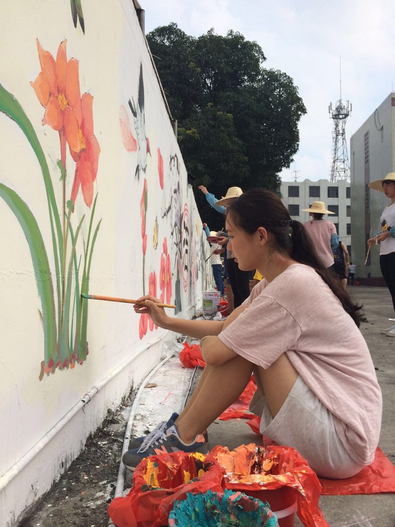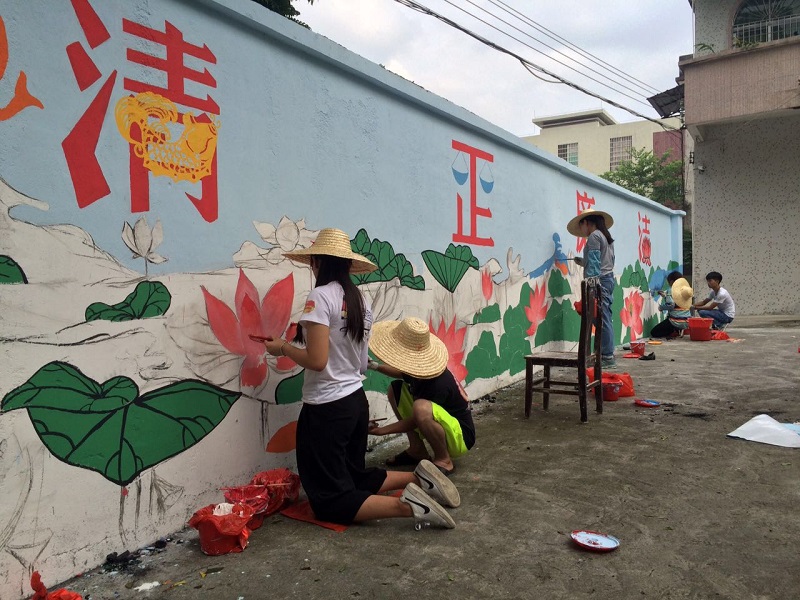 这是我校罗源写生基地合作项目调研队在四会市罗源镇开展的“三下乡”社会实践活动的工作场景。自活动开展以来,该队伍50余名师在四会市罗源镇政府广场持续进行着建设社会主义新农村墙绘活动。