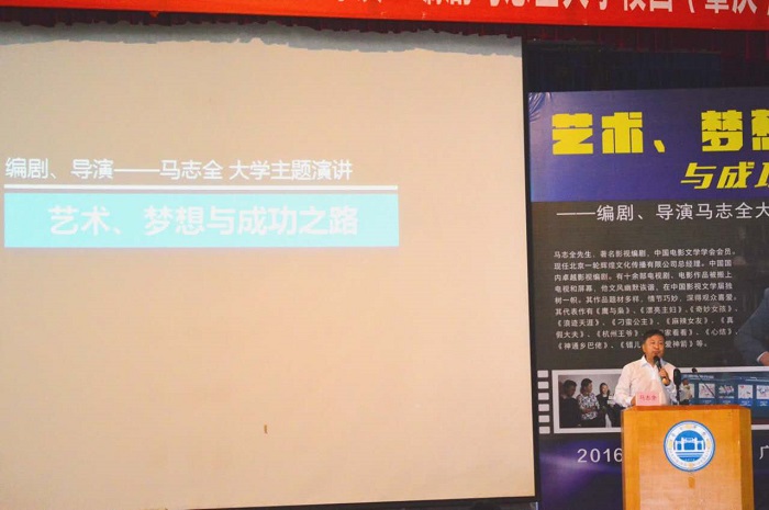 讲座上,马志全围绕艺术的特色、梦想和成功的关系两个方面展开演讲。他认为:“现在有部分中国文艺作品只浮于表面,不能做到从深层的角度去震撼大众的心灵,不能与大众精神世界产生共鸣。中国文艺应该百花齐放、弘扬正能量,达到净化灵魂的目的,让高贵的灵魂飘扬在中华民族的上空。其在文艺作品上的表现为血浓于水的亲情、真诚质朴的友情、美丽纯真的爱情等。”此外,他还提到成功要提高自身修养、要有坚韧精神、懂得抓住机遇与使用正确的方法。同时,他引用周恩来的名言“为中华之崛起而读书”告诉在场的学生做人树立一个伟大的目标,并为之而努力。