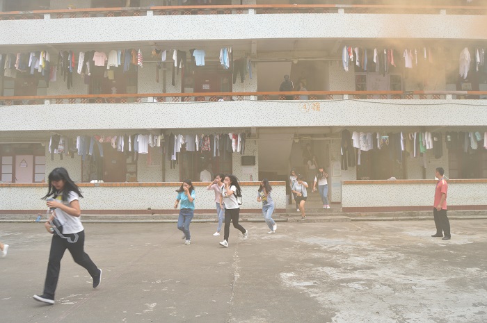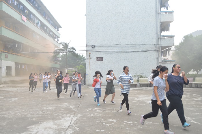 只听到砰的一声,以各栋楼305宿舍为引火点所燃起的烟雾迅速弥漫整片宿舍楼,警报声立刻随之响起。同学们用湿毛巾捂着口鼻,迅速从宿舍冲出,走下楼梯,向着指定的逃生路线跑去。其间,工作人员做了及时的疏散指导,在各个楼梯口和路口为同学们指引方向。在短短不到五分钟的时间里,几乎所有的学生们都到达了指定地点,其中最快到达的同学只用了一分钟的时间。张同学说道:“这次演练使我明白了火灾的严重性和危险性,以后会更加积极学习消防知识。”