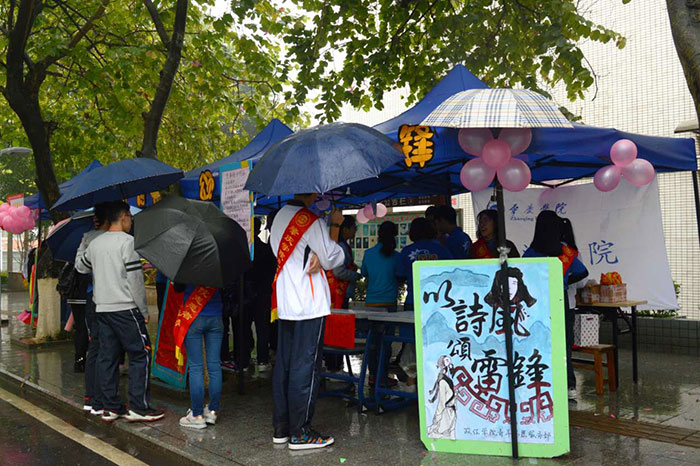 本网讯(记者 温锦梅 温焓芳 摄影/吴伊琳)3月18日,一年一度的雷锋月活动在紫荆校道上火热地进行。虽然下起了小雨,但同学们来参加活动的热情也依然高涨。其中,政法学院的“以诗风颂雷锋”活动更是吸引了不少人驻足。