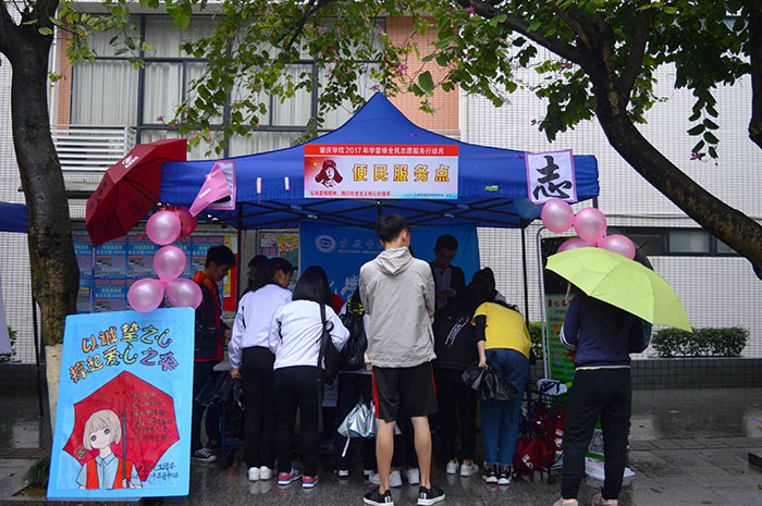本网讯(记者 李美良 吴静敏 摄影/吴伊琳)3月18日,我校青年志愿服务指导中心联合各二级学院青年志愿服务部举办的雷锋月活动于紫荆校道举行。其中,化学化工学院团委青年志愿服务部(简称:化工学院青志部)策划的“以诚挚之心,撑起爱心之伞”主题活动如火如荼地进行。