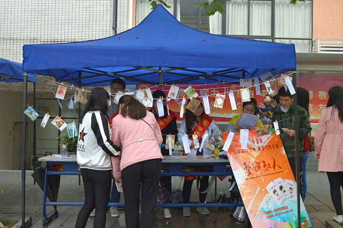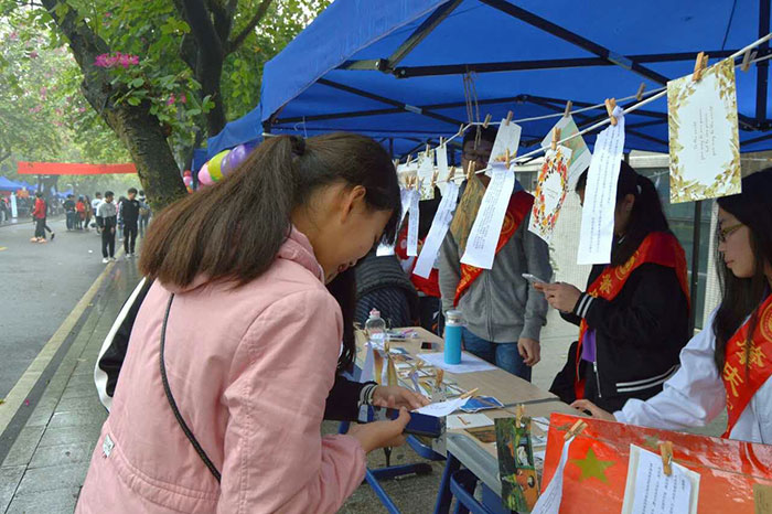 其中,文学院举办的以“望评知人”为主题的猜书名、猜人物活动吸引了许多来往的人。帐篷前的人时而驻足冥思,时而转首与朋友讨论,沉溺于这场文学的斗争中。“刘备”、“王熙凤”、“《巴黎圣母院》”等中外经典名著的书名和人名时不时从参与者的口中喊出,阵阵笑声从人群中传来,场面轻松而愉悦。