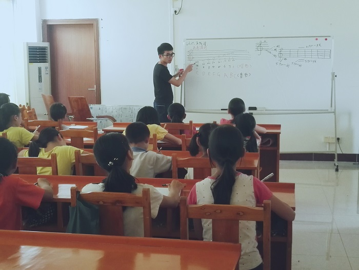 10日上午,志愿者们迎来了 35名学生。他们在艺术方面都是零基础。音乐学院志愿者从音符、音阶开始教学,去教导学生们的发音。美术学院志愿者从握笔方式到画面造型、线条、颜色一对一指导,并设定一些有趣的情景让学生结合生活,在快乐中了解美术,学习画画。通过一天的美术和音乐教学,学生们变得开朗起来,用实际行动表达了对艺术的热爱与激情。