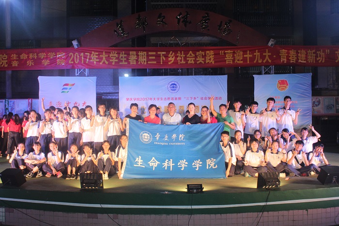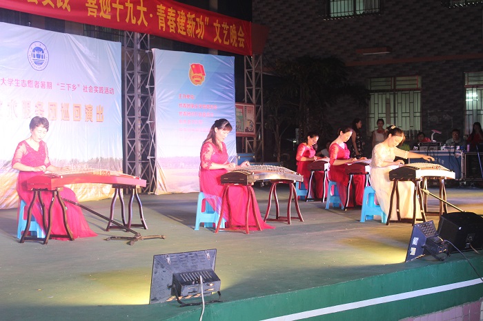 在一段开场舞后,晚会正式拉开帷幕。紧接着由生命科学学院老师组成的“砚园古筝艺术团”带来古筝合奏《青花瓷》,老师们的手指在琴弦上拨动着,发出美妙的声音,扣人心弦,赢得现场阵阵掌声。晚会接近尾声时,生命科学学院的志愿者表演手语《感恩的心》,传达出对封开县莲都镇政府,莲都中学及莲都镇各位父老乡亲的由衷感谢。