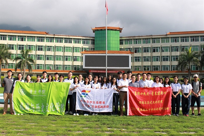 本网讯(通讯员 黄钊智)为深入贯彻落实习近平总书记系列重要讲话和重要批示精神,以良好的精神面貌和优异的成绩迎接党的十九大胜利召开,7月11日,旅游与历史文化学院围绕“喜迎十九大,青春建新功”主题,组织开展“党之星光”三下乡社会实践服务队于赴肇庆怀集县桥头镇进行扶贫旅游及修学旅游调研。我院党委副书记雷志科、团委书记段然等全程指导活动,26名学生干部参与本次活动。