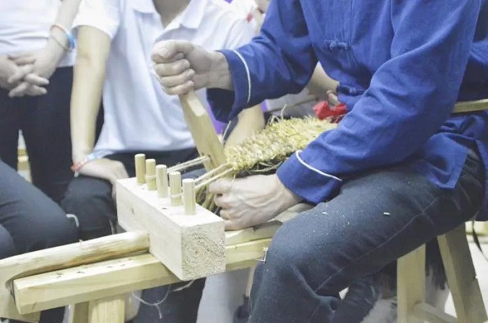 一把长凳、一把稻草、几件木制的工具,只见老师将稻草来回搓,穿过麻绳又拉紧,这些动作看似简单,却在心灵手巧间融入了民间手艺。体验编草鞋,不仅是对传统文化的传承,也能够让学员们体会到红军不怕苦不怕累的精神。