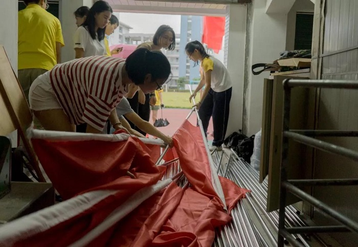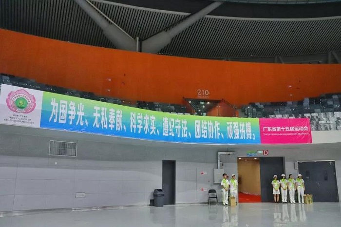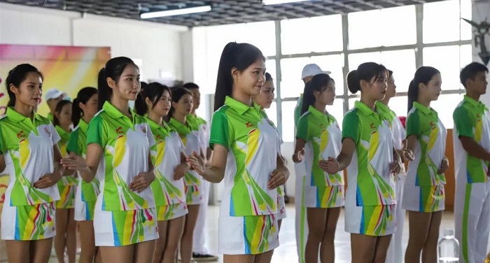 “下巴抬高!牌不能歪!保持好笑容!背部跟腿部要挺直!胸腔抬起!眼睛向上看!”我们举引导牌的姿势需统一,步伐一致,并引导各队伍保持好前后距离。经过长时间的严格训练,每个人的仪态表现得到了更好的展示。我们是引导员,走在省运会开闭幕式上各代表队的最前方,我们行进必须准确无误,保证仪式有序进行。