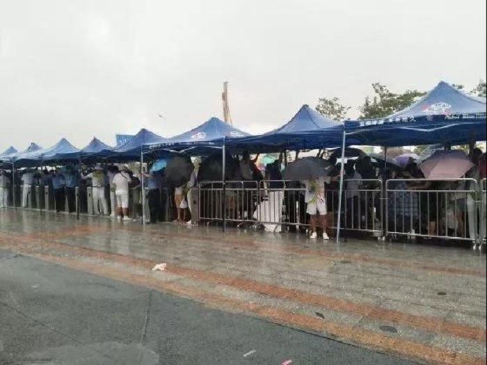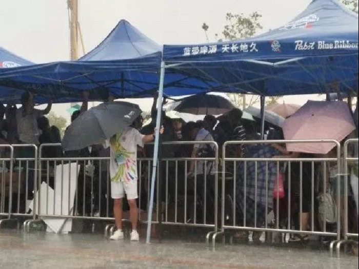 此时,志愿者们反应迅速,冒雨指挥观众进入帐篷内躲雨。在安置好观众之后,志愿者依然坚守工作岗位,在帐篷外用雨伞为观众挡雨,并紧抓住帐篷,以防帐篷被大风吹走,而自己却全身湿透。