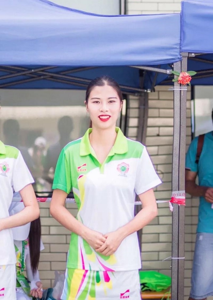 当初我报名参加志愿者是想要增加自己为他人提供志愿服务的体验。我们训练是从下午四点多集合到晚上十点多回来,这期间长达六个小时。虽然训练很辛苦,但是,在休息时间,我可以和朋友一起聊天增进感情。并且,能够为省运会增添自己的一份力量,让我觉得很开心!