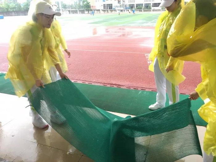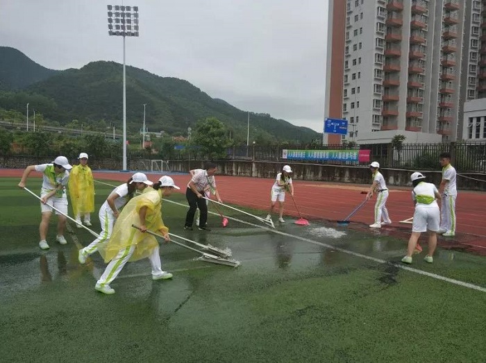 第一场比赛后,小七星们纷纷化身为勤劳的“清洁工”,清理球场上的积水。只见他们头戴白帽,身穿志愿者服,手执拖把,齐心协力把积水清理干净,为运动员安全顺利地进行比赛保驾护航。