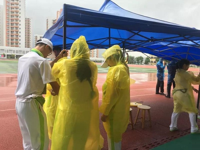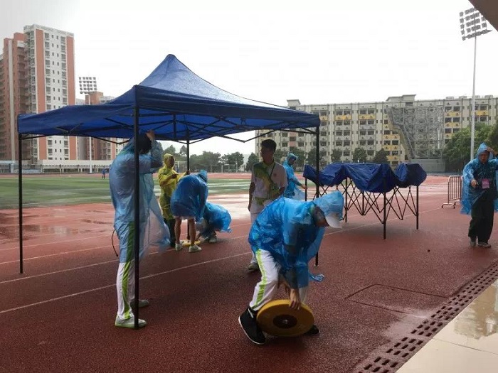 天空突然下起瓢泼大雨,小七星们的服务热情却毫无减弱。只见他们迅速穿上雨衣,收帐篷、摆铁马、铺设防滑垫,行动井然有序。