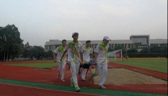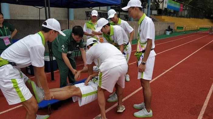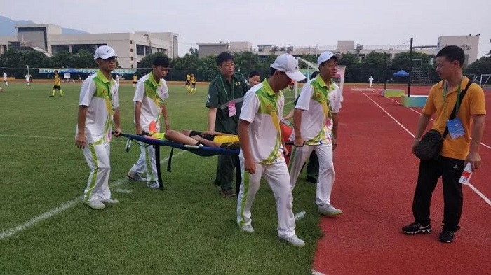 我的工作是负责足球比赛的医疗保障。上岗第一天,我的内心是紧张的,脑子拼命回想着培训的内容,生怕在工作上出现失误。当场上发生突发状况的时候,我们都屏住呼吸,耐心地等待裁判发出指令。当他做出担抬的动作时,我们便拿起担架,快速地跑向伤员,小心翼翼地把伤员抬出离赛场三米以外的区域进行治疗。