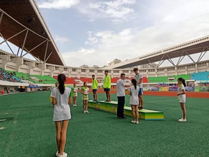 颁奖仪式开始,文明礼仪志愿者们端着托盘,引领嘉宾走向颁奖台,为运动员们颁发吉祥物。负责田径组的老师在中途空闲的时间与志愿者们分享了许多学习和生活上的经验,志愿者们收获颇丰。
