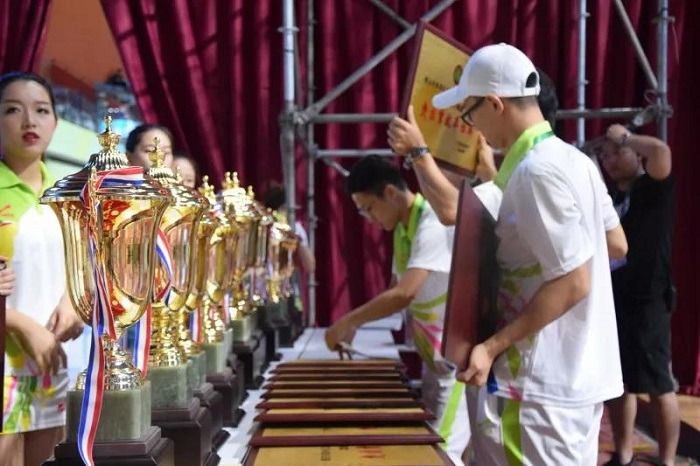 仪式现场志愿者正在整理奖杯、牌匾等,为接下来的颁奖服务。