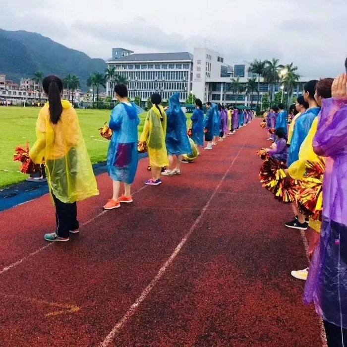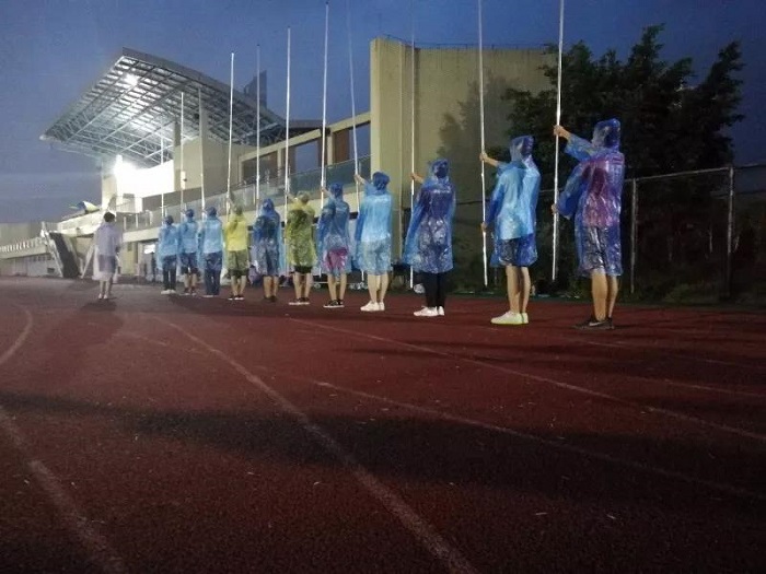 有时遇上下雨天,标兵们也丝毫不松懈,穿上雨衣便继续训练。头上的帽子抵挡不住雨水的侵袭,雨水便劈头盖脸地砸下来,砸在眼镜上,砸在刘海上,也落在标兵露齿的笑容里。当标兵志愿者们淋着雨坚持排练完后,回到宿舍便浑身湿透。