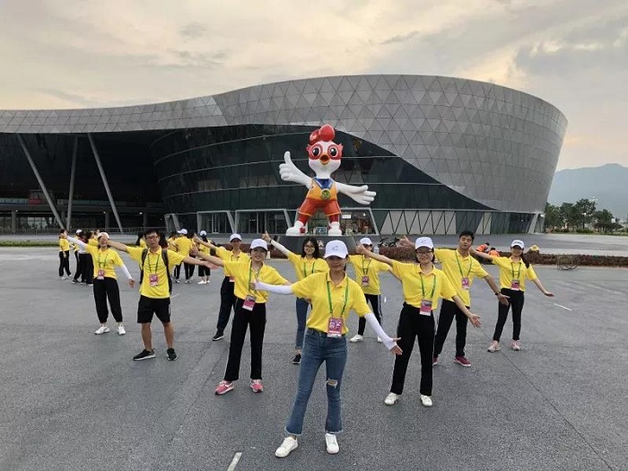 志愿者们学“庆庆”的仪态表达对省运会的祝愿