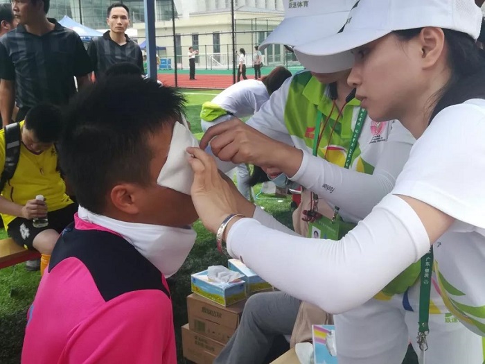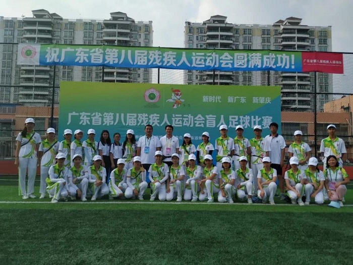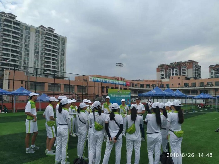 8月26日,盲人足球正式开赛,志愿者开始正式赛事志愿服务。志愿者们来到了肇庆市体育中心体育场。他们围成一圈站着,以便更好地去倾听老师为他们进行岗位安排。