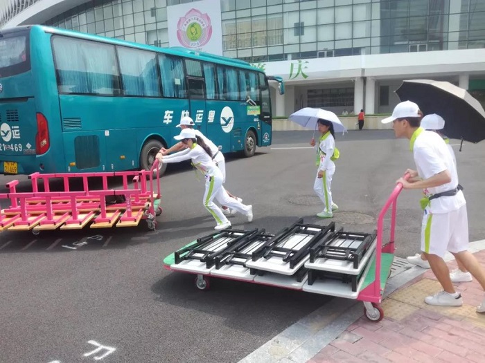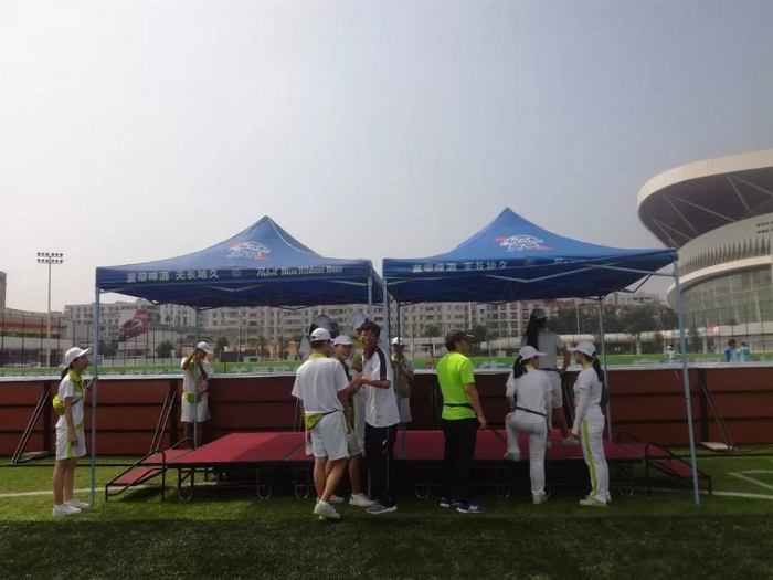 “一二三,我们向前一起走。”志愿者们齐心协力搬运服务盲人足球所需的相关物资以及比赛所需的物品,并搭建好休息用的帐篷。