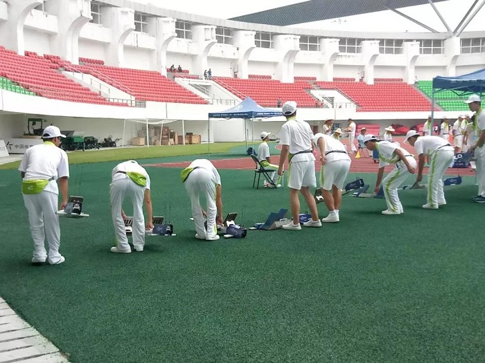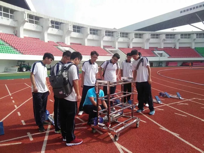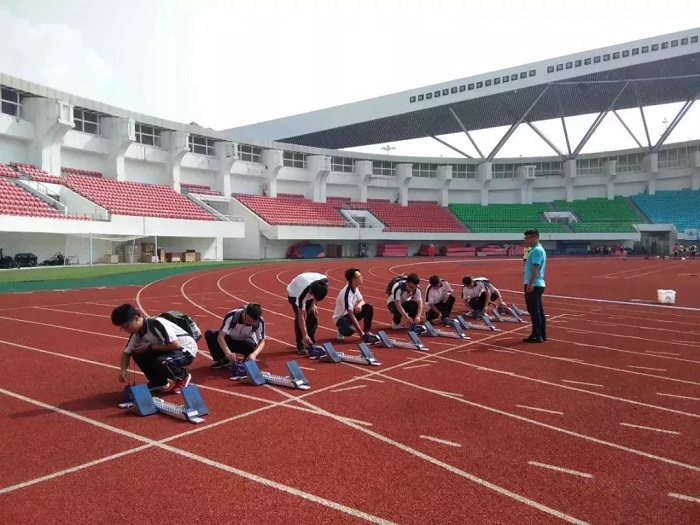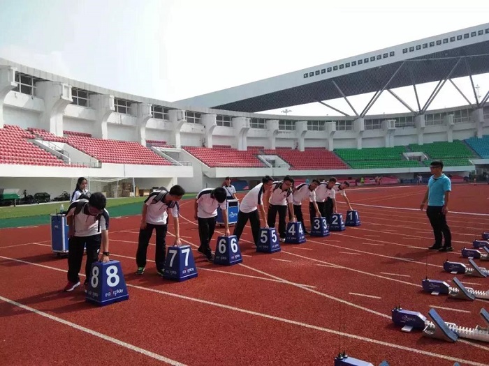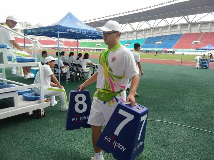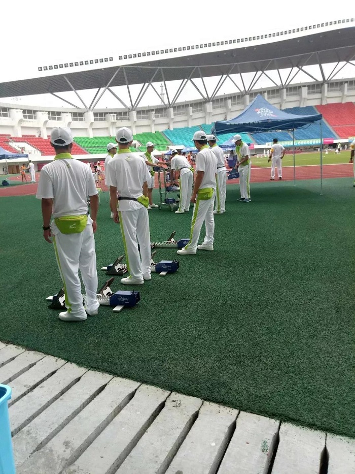 短跑比赛开始前,志愿者们一同站起,将助跑器放置赛道上,帮助参赛选手完美发挥自己的实力,取得理想的成绩。