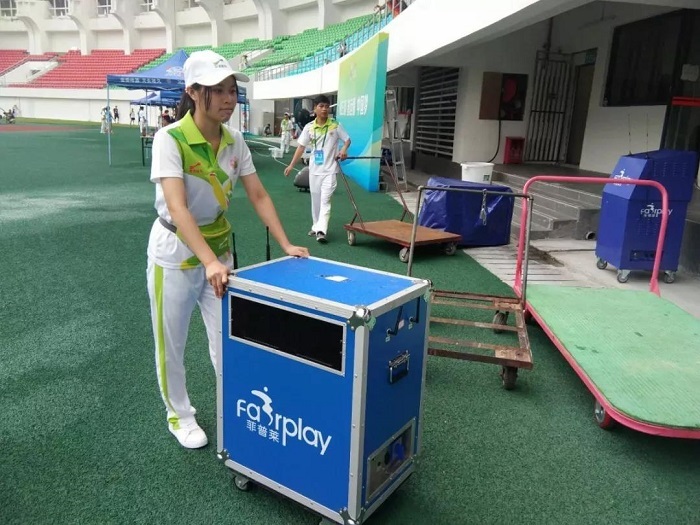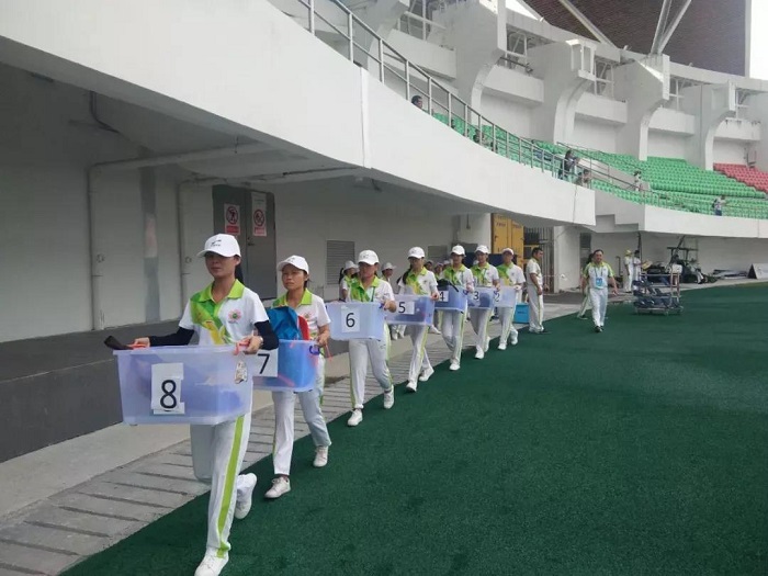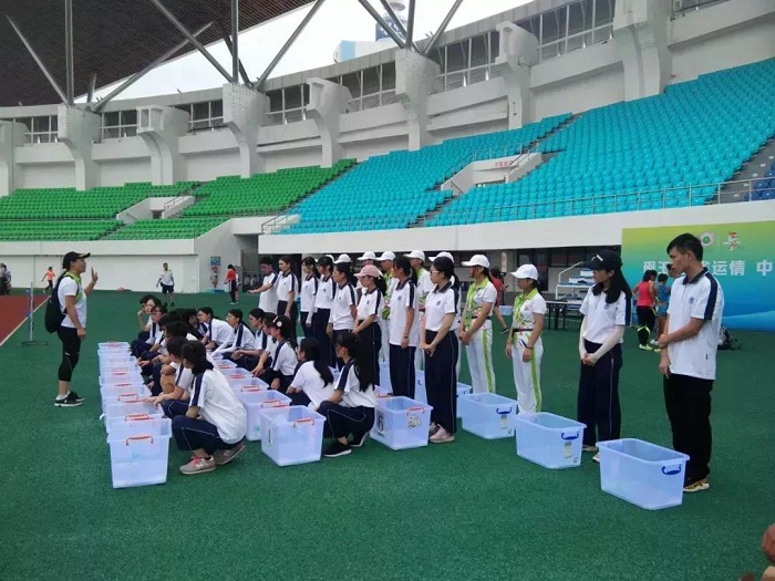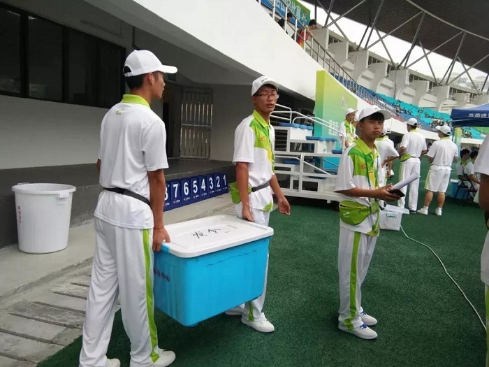 比赛前,志愿者们把为运动员准备的物资和器材都准备好,希望能在炎热的夏天,为他们添上一抹清凉。