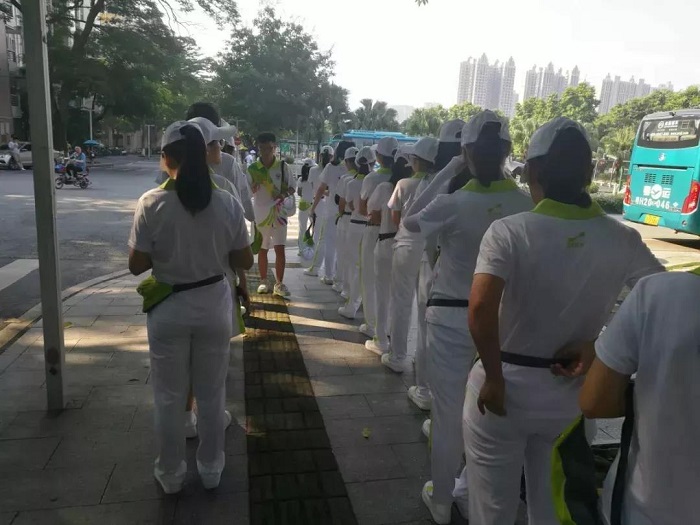 “收腹挺胸!”作为赛事志愿者,志愿者们的仪容仪态也同样重要。手需统一地向后放,步伐也需一致……