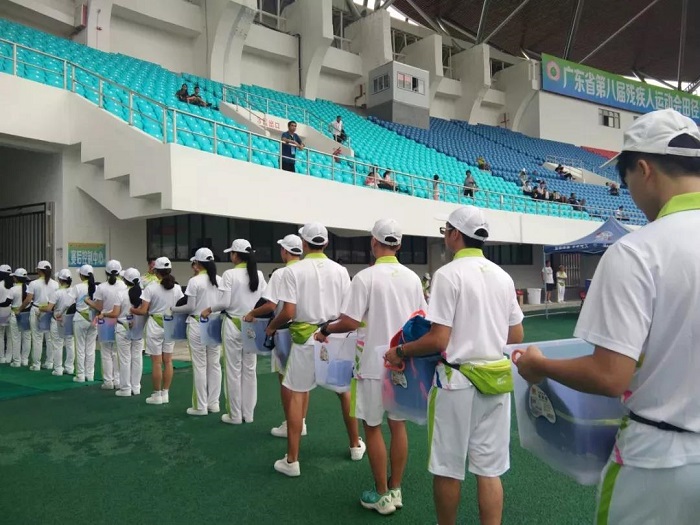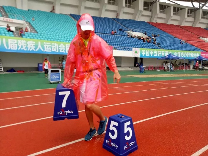8月28日,广东省第八届残疾人运动会田径比赛如火如荼地进行。虽然天公不作美,田径场下起了暴雨,但志愿者们依然坚守岗位,穿行站立在狂风暴雨中,守护着每一场比赛。运送运动员衣物、安装助跑器、搬运跑道牌等等,他们未停下过脚步……正是他们的认真负责,确保了比赛的正常进行。