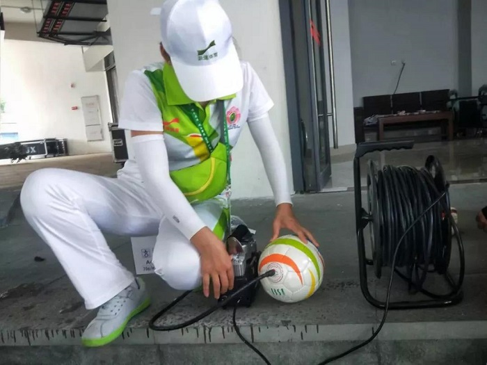 志愿者正在为足球打气
