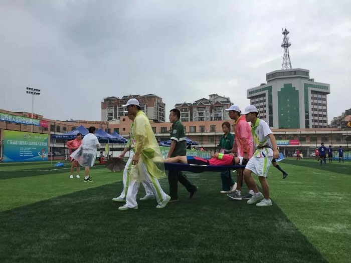 志愿者抬受伤的运动员下场