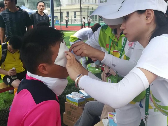 志愿者为盲人足球运动员带眼罩