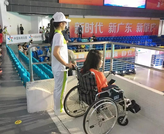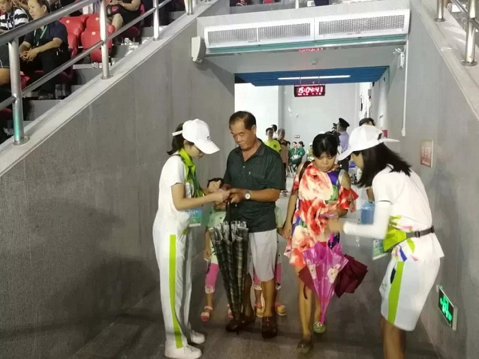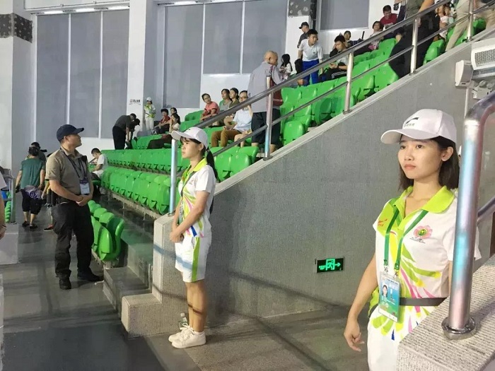 场内赛事志愿者的志愿服务工作是到提前到现场踩点,熟悉场地座位席、卫生间、医疗点、出入口等以及在演出时提供志愿服务。他们的工作分为两部分:一是在场外对观众进行引导和对轮椅残疾人进行帮扶服务。