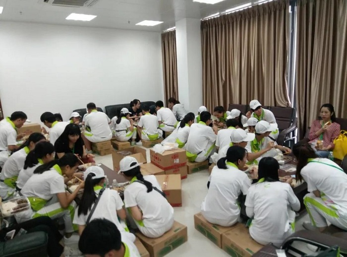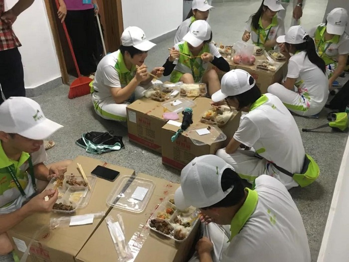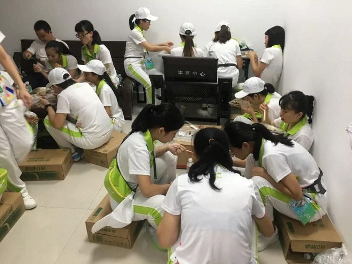 凳子不够坐,箱子拿来凑。“小七星们”围坐在桌子周围,享受着热气腾腾的饭菜。一整天的辛勤服务,“小七星们”可饿坏了,围坐在一起,大口大口地吃着盒饭。