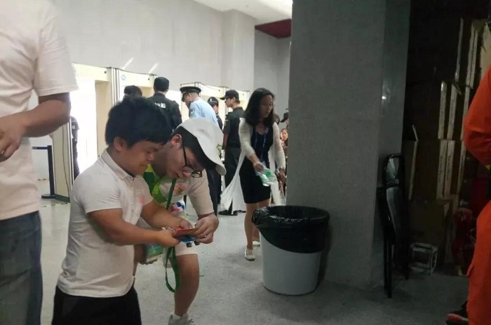 来观看此次残疾人闭幕式演出的,还有许多残疾人士,他们不辞勤劳来到现场,为残疾运动员加油打气。图一为“小七星”通过手机打字方式为一聋哑人人士提供帮助。图四中的“小七星”蹲下为一观众解答时,小小细节,备受感动,为你们点赞,更为这些“折翼天使”点赞!
