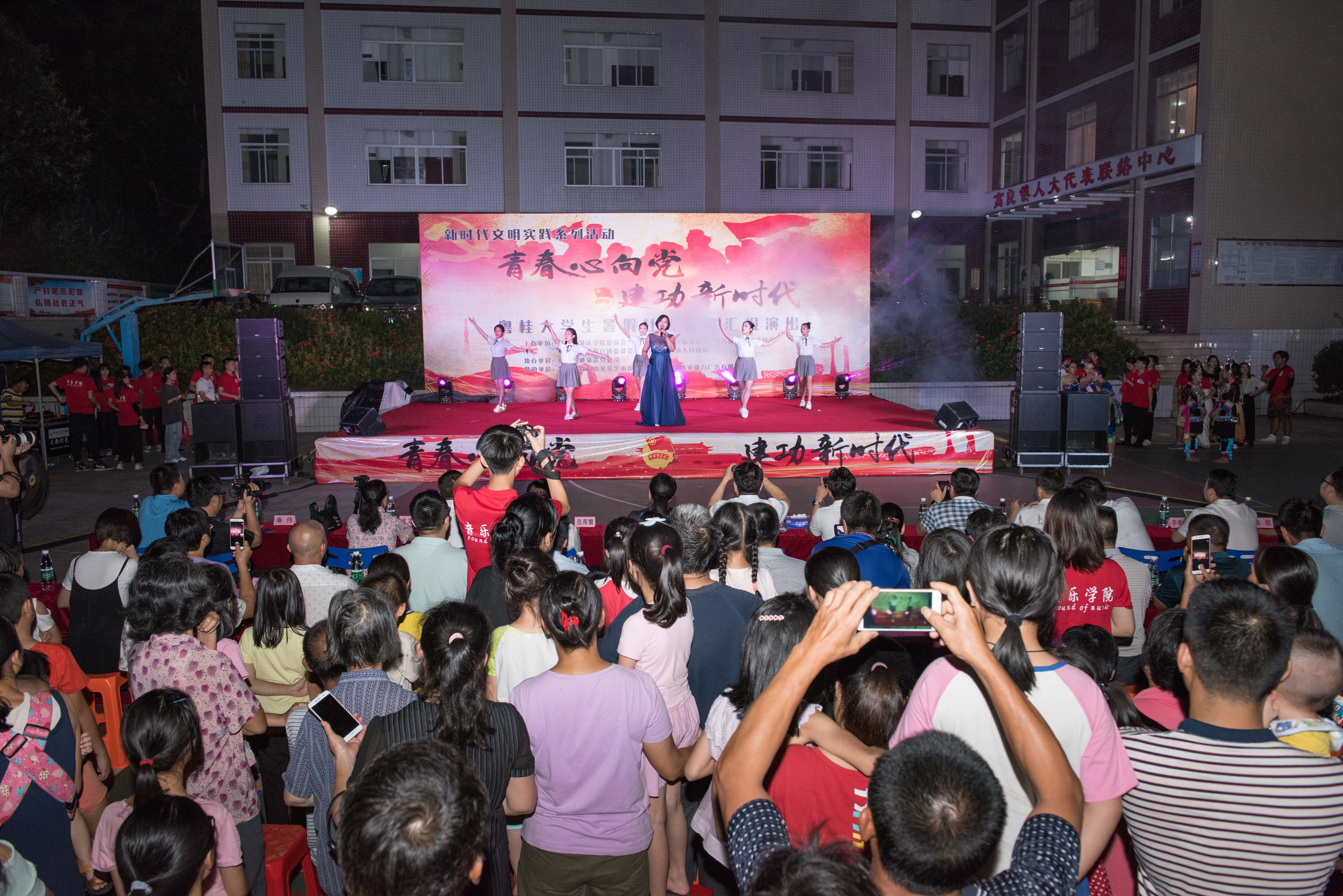 是日晚,两校在德庆县高良镇联合举办“青春心向党·建功新时代”粤桂大学生暑假社会实践汇报演出,当地村们献上精彩的演出。汇演精彩纷呈,民乐重奏《金蛇狂舞》、粤剧舞蹈《女驸马》、配乐朗诵《走复兴路,园中国梦》、国家级艺术基金项目《走呦走呦》、侗族大歌《侗家待客喜盈盈》、独唱《不忘初心》等节目相继出场。参演的师生们用粤桂文化交融的独特方式展现当代青年爱党、爱国的青春热忱。晚会现场热闹非凡,座无虚席,吸引了一千多名群众观看。