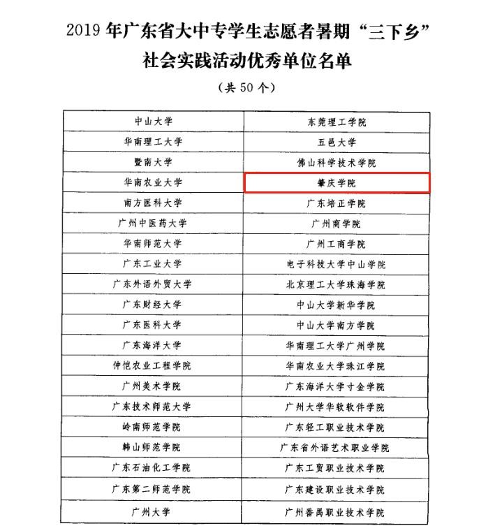 2019年广东大中专学生志愿者暑期 “三下乡”社会实践活动优秀单位名单