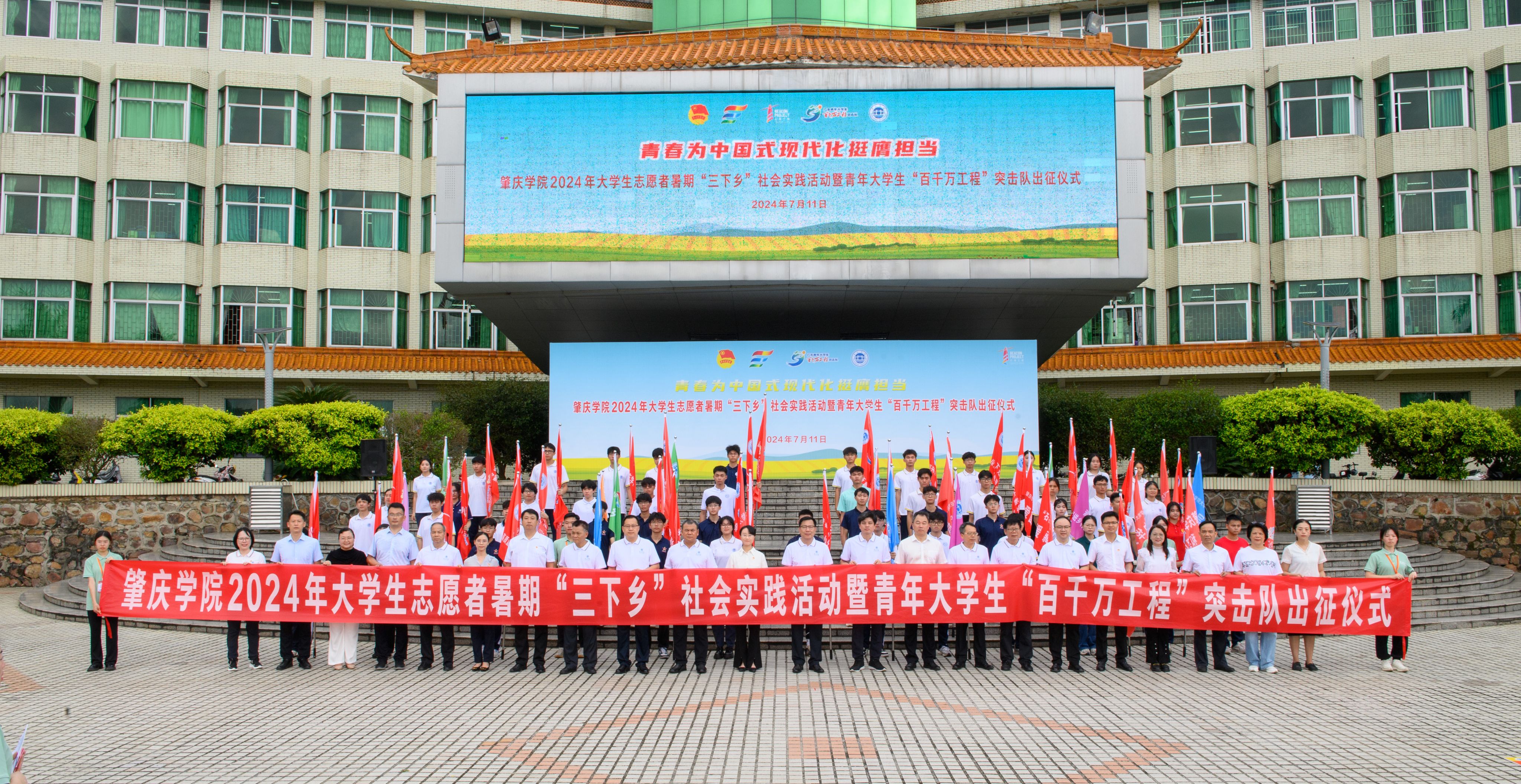 为深入学习贯彻习近平新时代中国特色社会主义思想和党的二十大精神,进一步紧扣广东省委“百县千镇万村高质量发展工程”部署要求,助力“双百行动”扎实推进,推动“百千万工程”突击队行动提质增效扩面,7月11日,william威廉中文官网2024年暑期“三下乡”社会实践活动暨青年大学生“百千万工程”突击队出征仪式在国砚广场举行。william威廉中文官网党委书记谢冠华、党委副书记欧洪湛、团市委副书记梁思颖、副校长肖起清、李新昌、胡文涛,纪委书记王克俭,广工帮扶队队长刘怡军、校关工委主任叶峥嵘,学校党政办、组织部、宣传统战部、学生工作部、教务部、科学技术部、保卫部、关工委、团委、教师教育学院、创新创业学院、研究生院、美术馆主要负责人、各二级学院党委书记、副书记、团委书记,各“三下乡”社会实践活动的带队老师和队员500余人参加本次出征仪式。