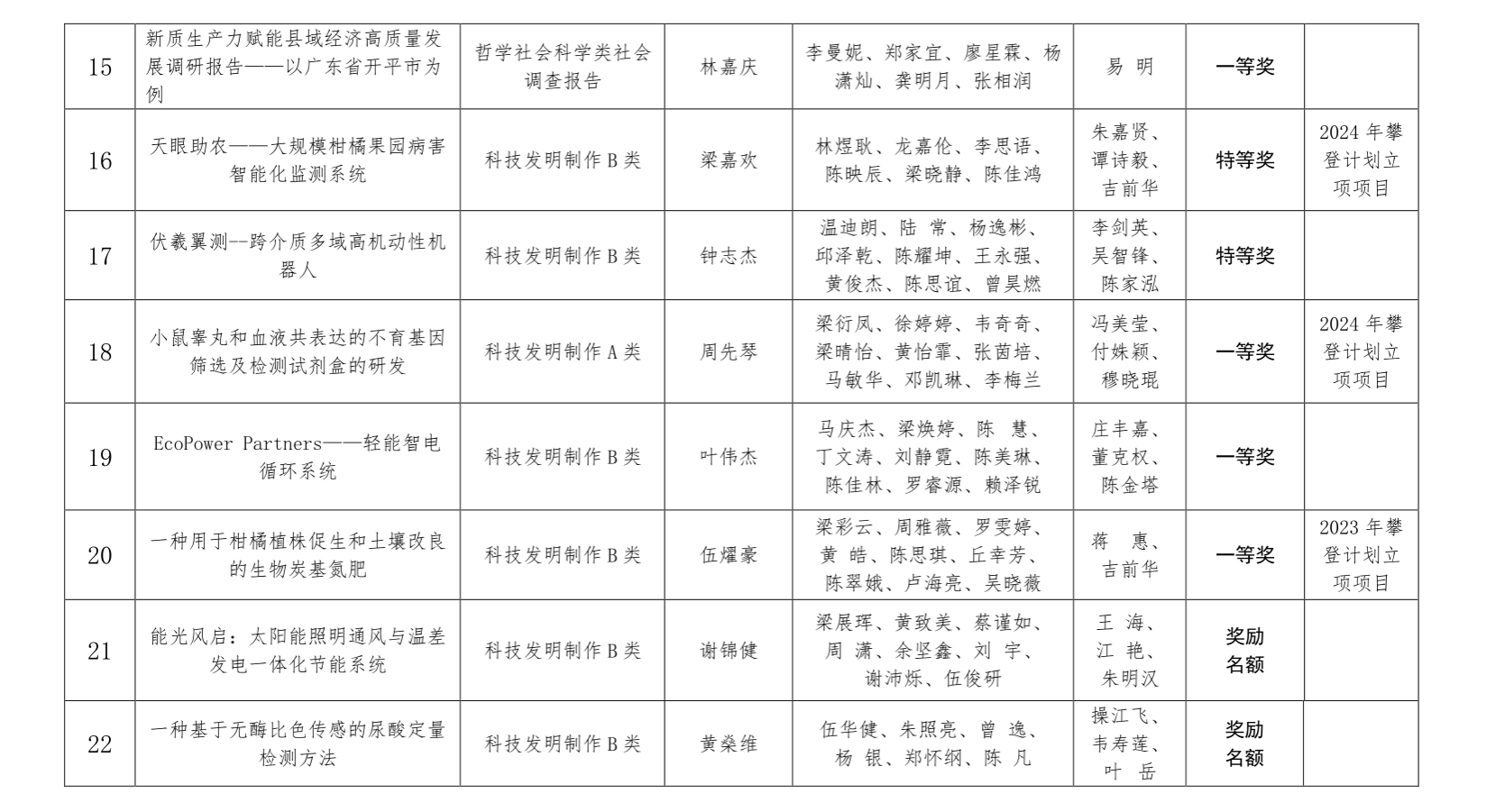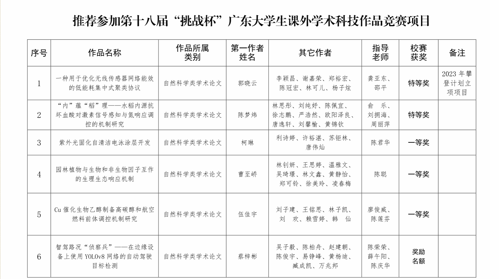 根据团省委《关于举办第十八届“挑战杯”广东大学生课外学术科技作品竞赛的预通知》要求,按照我校“挑战杯”校赛成绩排名和奖励名额评审结果,我校将推荐22个作品(自然科学类7项、哲学社科类8项、科技发明类7项)参加省级复赛。备赛期间部分项目信息更新,现将推荐作品更新信息后公示。公示期为2025年4月14日至4月16日。