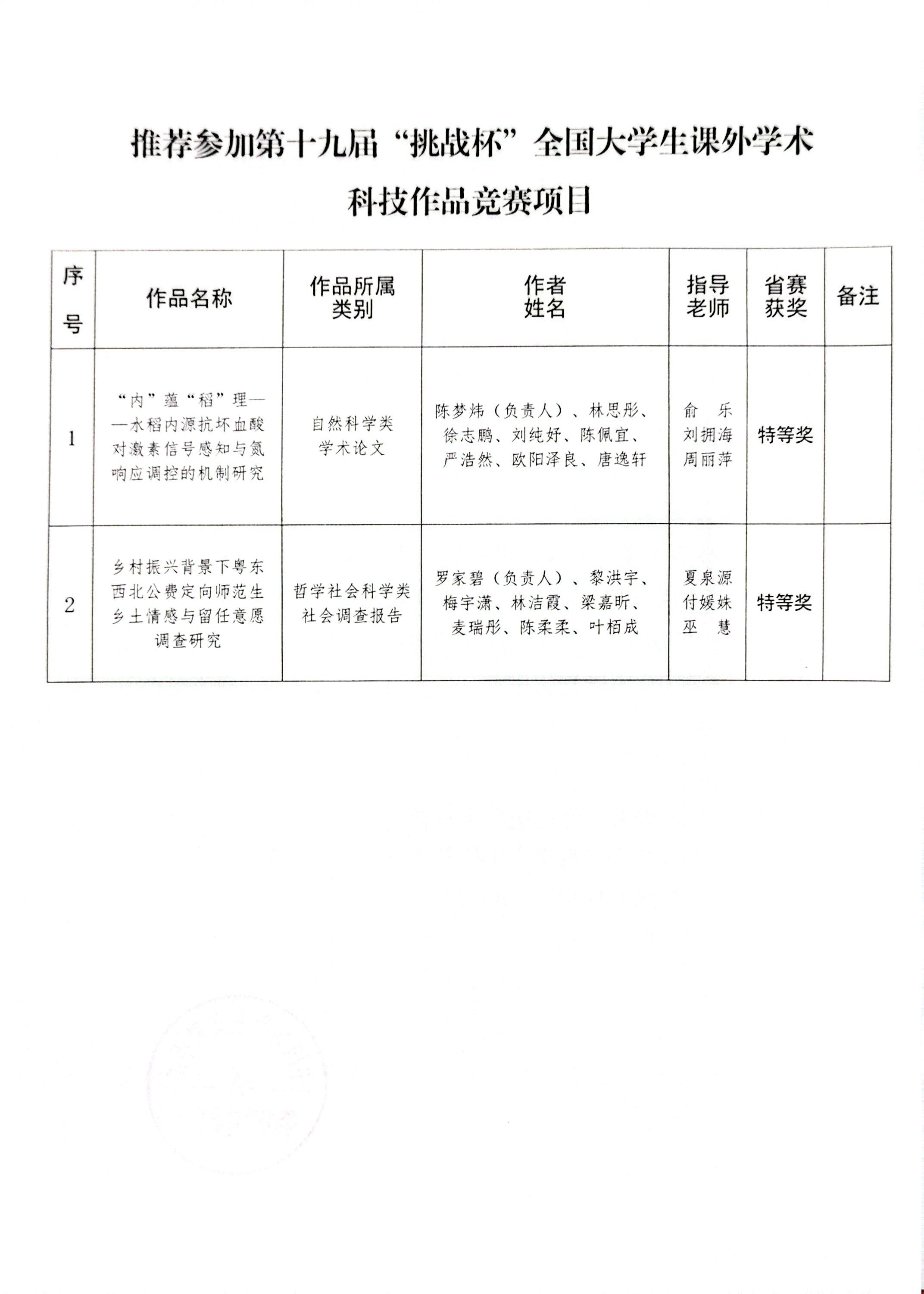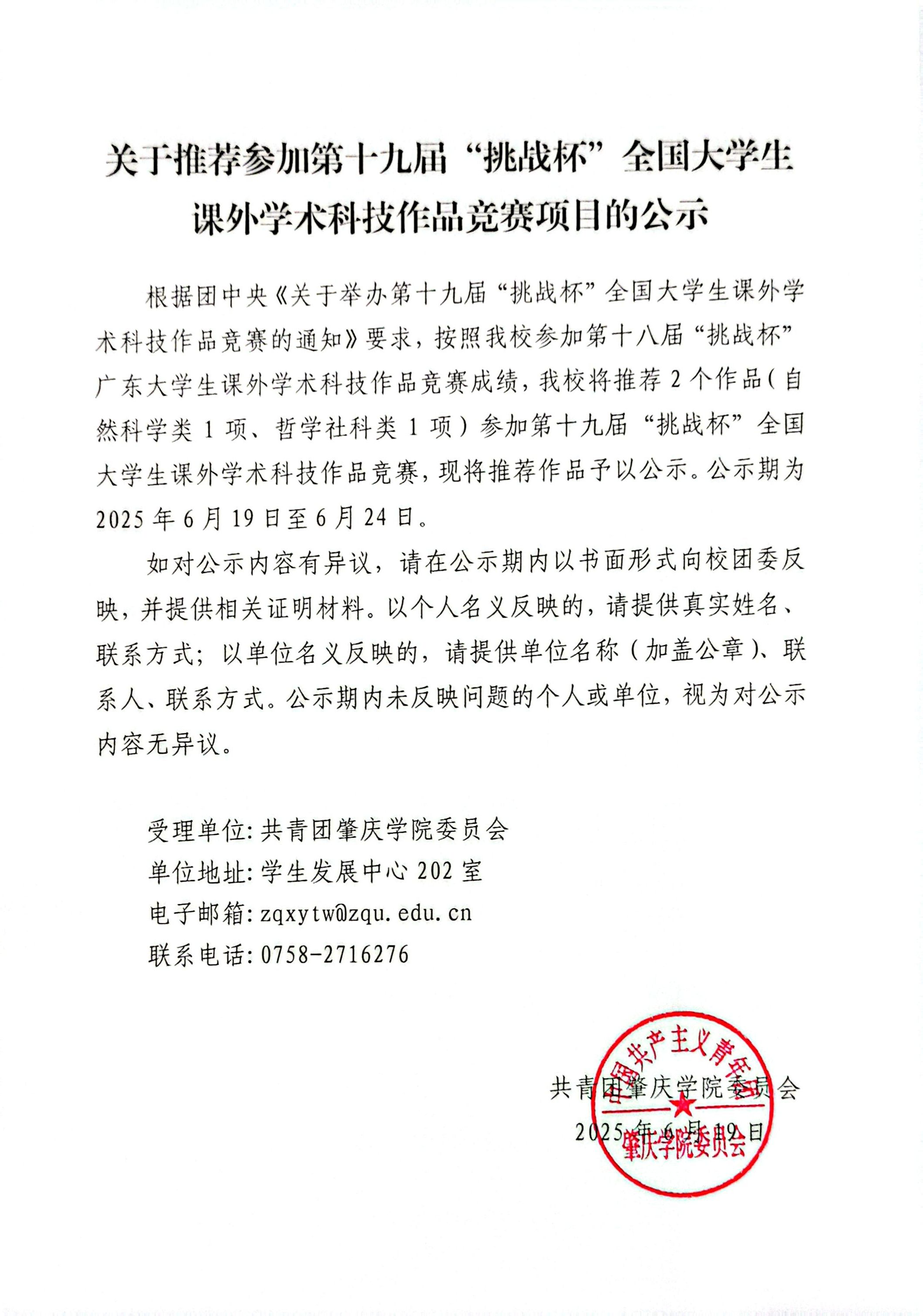 根据团中央《关于举办第十九届“挑战杯”全国大学生课外学术科技作品竞赛的通知》要求,按照我校参加第十八届“挑战杯”广东大学生课外学术科技作品竞赛成绩,我校将推荐2个作品(自然科学类1项、哲学社科类1项)参加第十九届“挑战杯”全国大学生课外学术科技作品竞赛,现将推荐作品予以公示。公示期为2025年6月19日至6月24日。