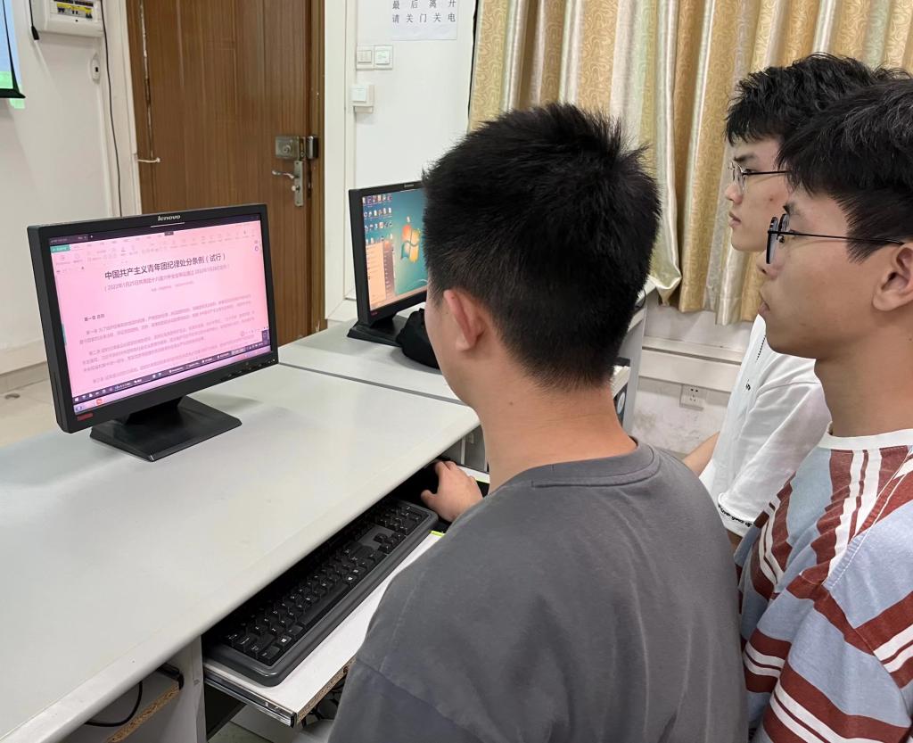 (图片三 团支书与团员青年共同学习《中国共产主义青年团纪律处分条例(试行)》)